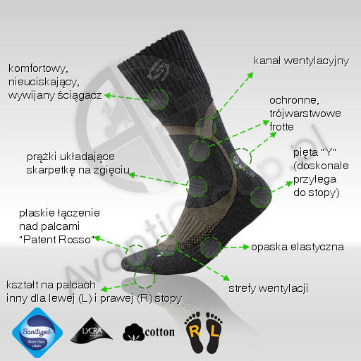 ** Bezuciskowość i dopasowanie: nowoczesne włókno LYCRA® zastosowane w całej skarpetce zapewnia jej idealne, bezuciskowe dopasowanie. Dłuższa bezuciskowa cholewka o specjalnej konstrukcji, z możliwością jej wywijania na but. Skarpetki dostosowane do anatomicznego kształtu lewej (L) i prawej (R) stopy nie tylko przez odpowiednie wyprofilowanie frotte, ale i ukształtowanie innego konturu dzianiny wokół palców lewej i prawej stopy.