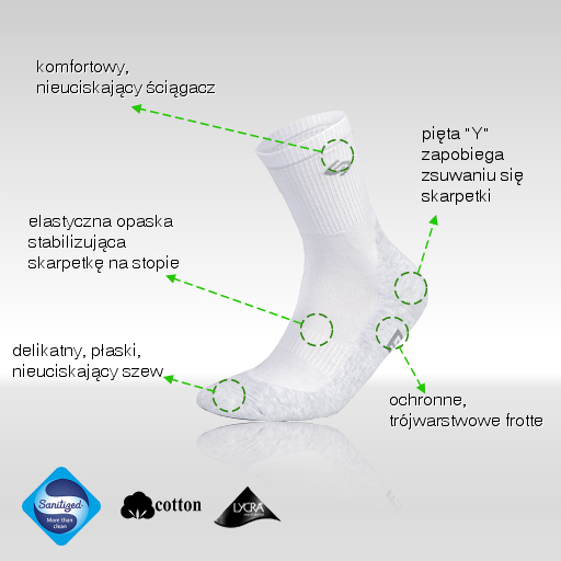 ** Bezuciskowość i dopasowanie: nowoczesne włókno LYCRA® zastosowane w całej skarpetce zapewnia jej idealne, bezuciskowe dopasowanie do kształtu stopy. Specjalny splot ściągacza zapewnia optymalne przyleganie bez uciskania.