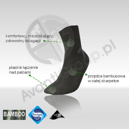 Specjalna konstrukcja cholewki zapewnia brak ucisku – nie tamuje przepływu krwi. Niewielka domieszka włókna Lycra® w całym wyrobie powoduje idealne przyleganie do nóg i jednocześnie maksymalną elastyczność – komfort nawet dla opuchniętych nóg. Niezwykła delikatność w dotyku przędzy bambusowej w połączeniu z bezszwowym łączeniem nad palcami gwarantuje wygodę osobom o bardzo wrażliwych stopach,np. stopach cukrzycowych. Naturalne, trwałe właściwości antybakteryjne przędzy bambusowej są wzmocnione wbudowaną we włókna antybakteryjną i antygrzybiczą apreturą Sanitized® (szwajcarska licencja Sanitized®), co zapewnia niemal całkowitą eliminację mikrobów i mocne działanie antyzapachowe. Naturalna zdolność przędzy bambusowej do oddychania (wentylacji stóp) i pochłaniania nadmiaru wilgoci powoduje relaksujące oddziaływanie na stopy.